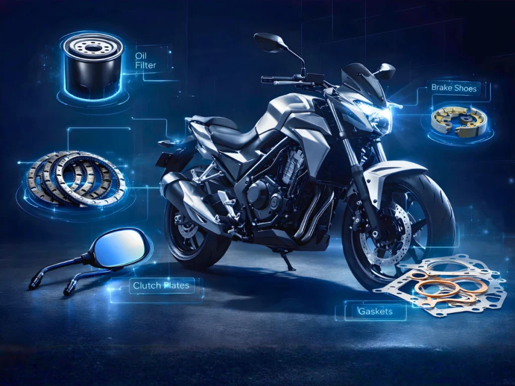 Discover our premium range of two wheeler spare parts including oil filters, brake shoes, clutch plates, rear view mirrors, and gaskets, engineered for durability, safety, and smooth performance.